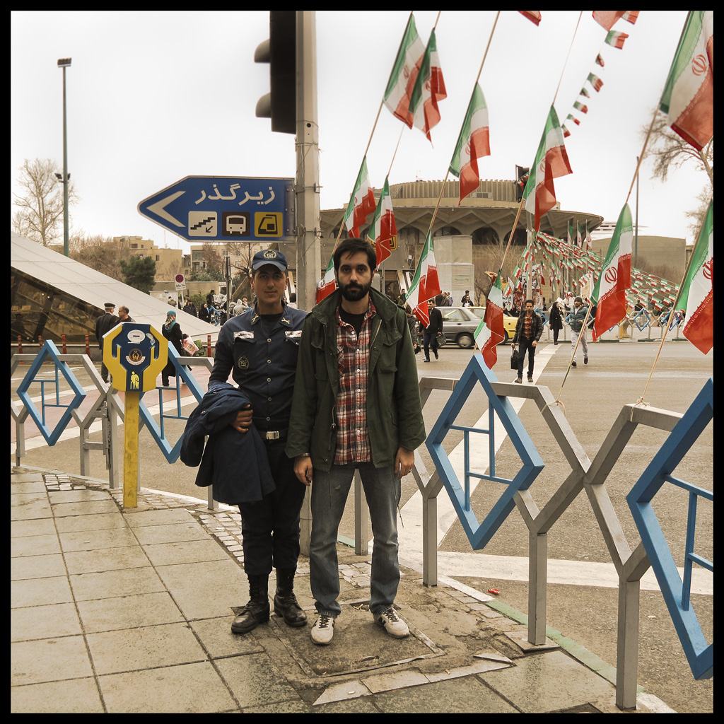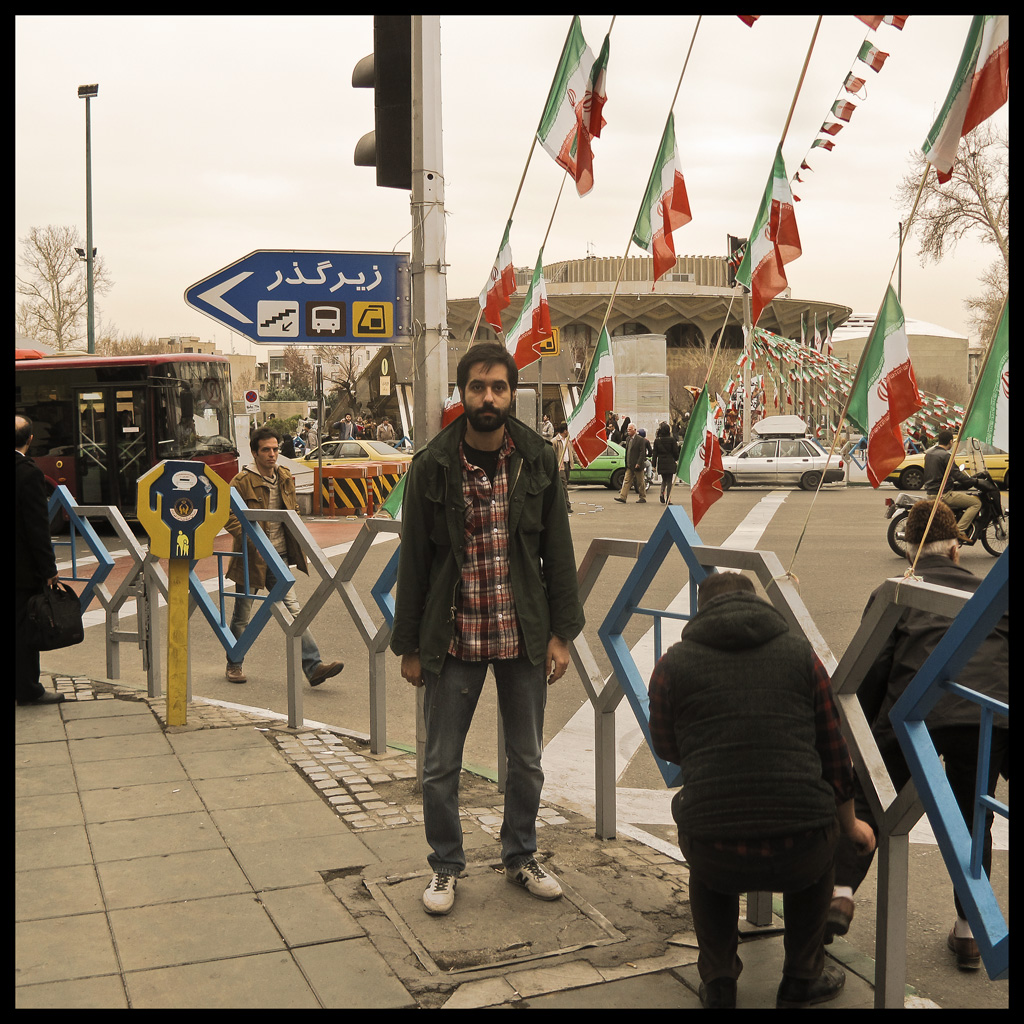 A few years ago in Tehran, Vali-e Asr Intersection pedestrian underpass became operational. Construction of an underpass, underneath Vali-e Asr Intersection, where the most important streets in Tehran meet the city installed iron fencing, a means of saying ‘Keep off!’. This forced people underground to keep them off the streets as part of the Urban Despotism project at the pretext of traffic control. In this project I placed a fixed-frame camera to record snapshots which included the fences, guide signs, charity boxes, flags, cultural and iconic buildings, and me, the artist, standing still like the rest of the elements. (2016)